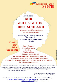 Erzählcafé:MIR GEHT’S GUT IN DEUTSCHLAND Menschen erzählen aus ihrem Leben in Deutschland Am Dienstag, den 29. September 2015 um 19:30 Uhr Café Alter Markt, Weiherwiese 2, Idstein |